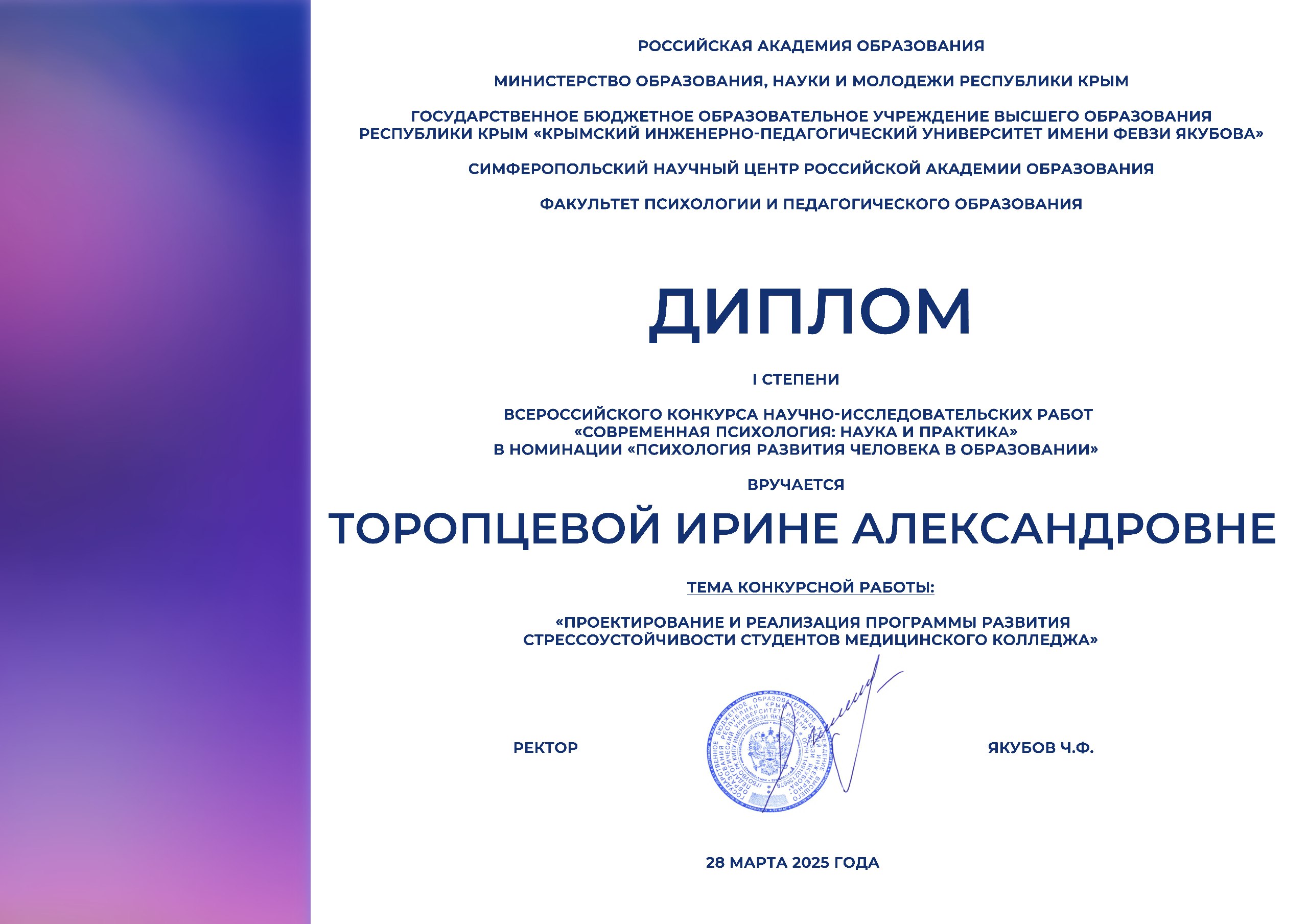 ЗАВЕРШИЛСЯ ВСЕРОССИЙСКИЙ КОНКУРС НАУЧНО-ИССЛЕДОВАТЕЛЬСКИХ РАБОТ «СОВРЕМЕННАЯ ПСИХОЛОГИЯ: НАУКА И ПРАКТИКА», организованный совместно Симферопольским научным центром Российской академии образования КИПУ имени Февзи Якубова и факультетом психологии и педагогического образования КИПУ имени Февзи Якубова.